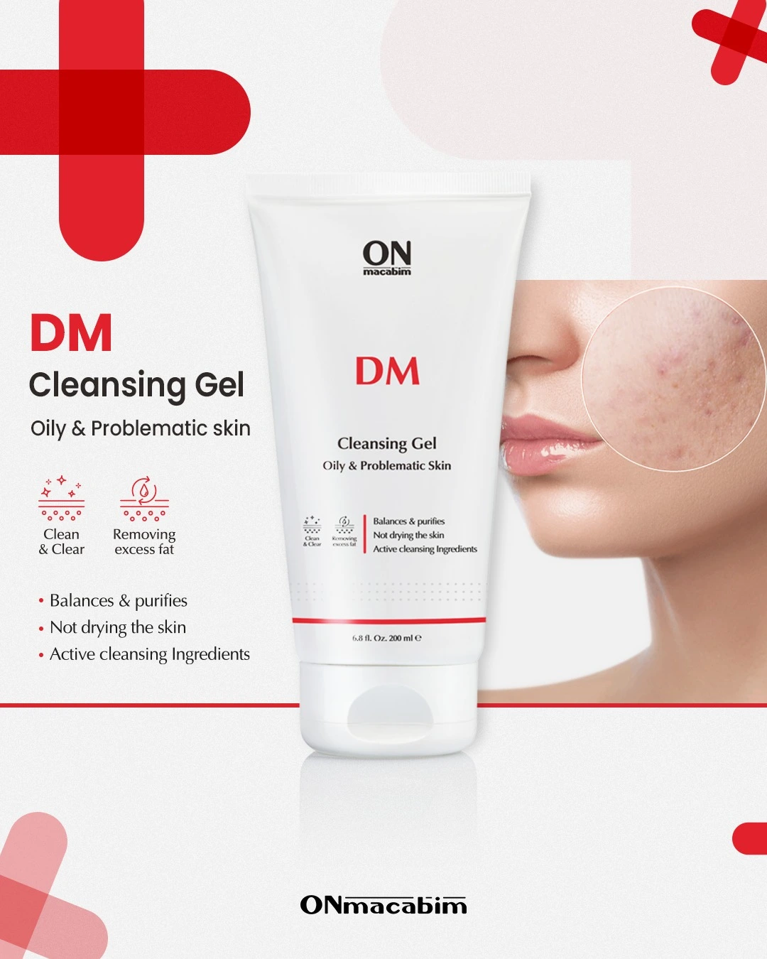 ONmacabim DM valomasis gelis riebiai/probleminei odai subtilus, lengvai putojantis, uždegimą mažinantis veido odos valymo gelis.